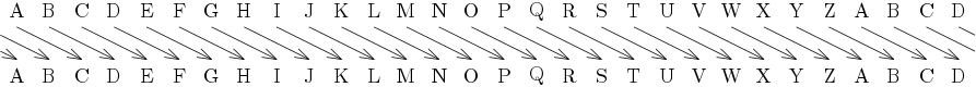 例えば,平文が「ELEPHANT」であり,鍵が「2」である場合,「ELEPHANT」の各文字を2だけずらし,暗号文として「GNGRJCPV」が得られる.アルファベットにおいて2個だけ後ろにずらす操作は次の図のようにして理解できる.